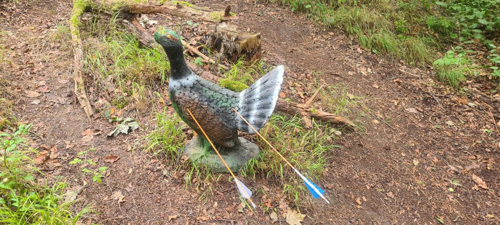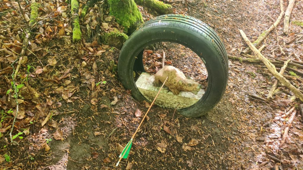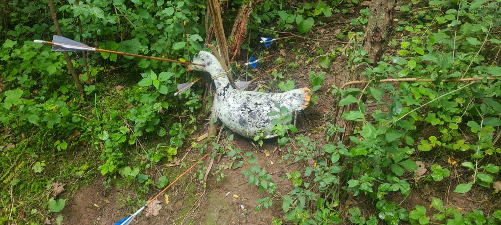 Bei Ziel 30 konnten wir nicht vom Pflock schießen, weil ein Baum im Weg lag. Aber wir haben einfach mit gleicher Entfernung etwas rechts daneben stehen können! Trotzdem haben wir beide mit dem ersten Pfeil getroffen!
