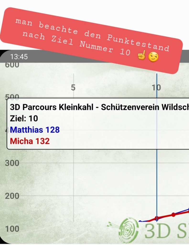 Trotz der Umgewöhnung, konnte ich mein letztes Ergebnis, um 16 Punkte, auf 386 erhöhen. Außerdem durfte ich genau an Ziel 10 ein einziges mal um 4 Punkte vor Matthias führen.
