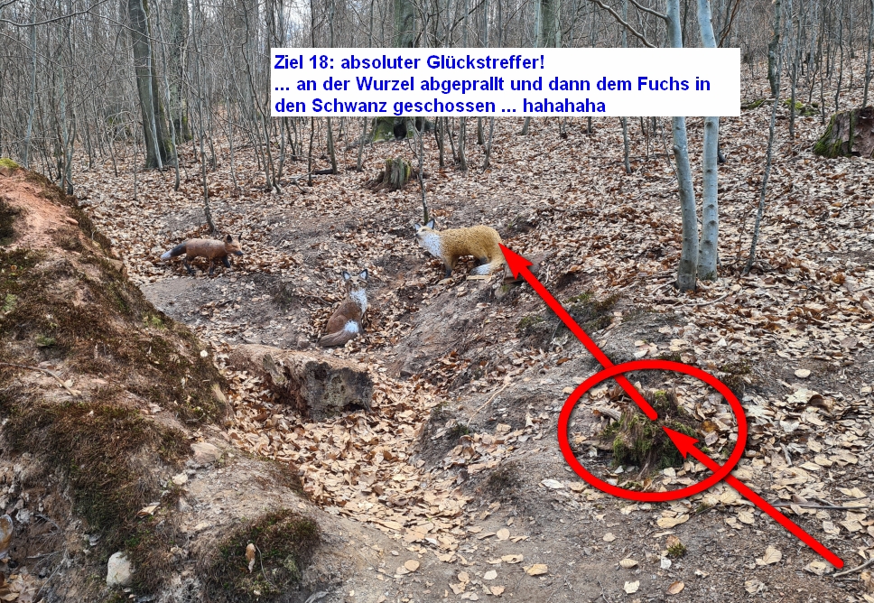 Wetter war wieder okay, ca. 8 bis 12 Grad. Teilweise sonnig, manchmal windig. Aber wir hatten für alle Eventualitäten Klamotten und Mützen dabei. Der Parcours ist deutlich weitläufiger als Kleinkahl, obwohl beide Parcours 33 Ziele haben. Die Ziele sind wirklich sehr liebevoll aufgestellt worden und es ist wirklich nicht ganz einfach sich für ein Tier zu entscheiden. Es gibt immer sehr viele Möglichkeiten. Es geht über Wiesen und dann lange durch den Wald. Dabei werden einige Höhenmeter überwunden, deutlich anstrengender als Kleinkahl, aber dennoch auch extrem schön und wir hatten sehr viel Freude beim durchlaufen des schönen Areals. Viele deutlich weitere Ziele und oft auch extrem Schüsse nach oben oder unten. Auch der Stand ist oft nicht ganz einfach, aber das ist eben auch die Herausforderung.