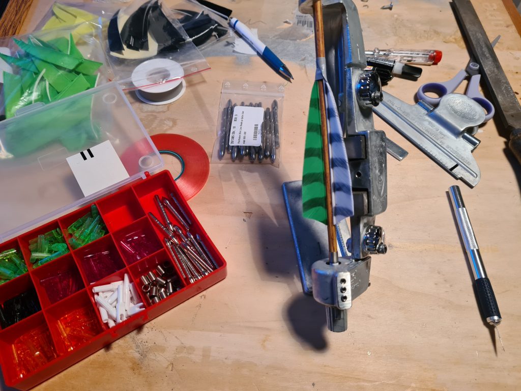 Dank der vielen Tipps von Matthias, dem richtigen Werkzeug und ein paar Videos, hat der Pfeilbau Anfang sehr gut funktioniert! Ich wollte allerdings mal Isolierband anstatt Schrumpfschlauch zum Schutz der Federn verwenden. Das hat scheinbar gut geklappt, aber nach einigen Stunden löste sich der Anfang des Klebebandes. Also doch nix und sofort auf Schrumpfschlauch umgestellt. Man muss halt alles herausfinden, wobei Matthias sofort auf Schrumpfschlauch gesetzt hat.