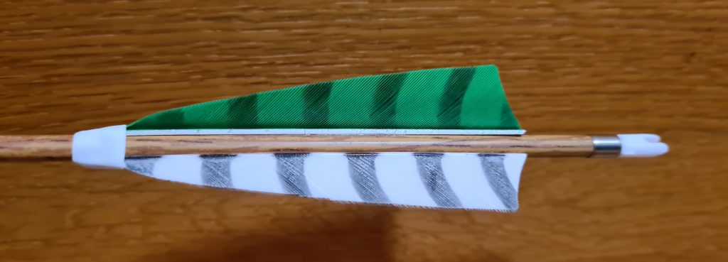 50 Schutzringe, 7 Penthalon Slimline Holzoptik, Federn dazu und camouflage Federn in Gelb und Blau zum testen. Dazu noch einen Sehnenspanner. Damit ich alle Pfeile bauen kann. (12 Grüne, 12 Holzoptik, ein Testpfeil und 3 Ersatzschäfte.