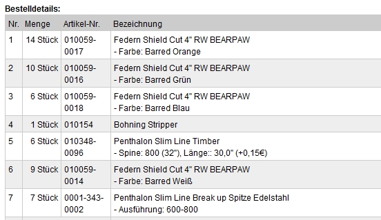 6 neue Penthalon Timber Slim Pfeilbausätze bestellt. Weil ich Kummerklinge nicht traue mit nur 12 Pfeilen 🙂 Diesmal mir orange gestreiften Federn. Mal sehen wie die so aussehen. Außerem so ein Bohning Stripper „Klebereste Schaber“ bestellt, zum Entfernen von Federn!