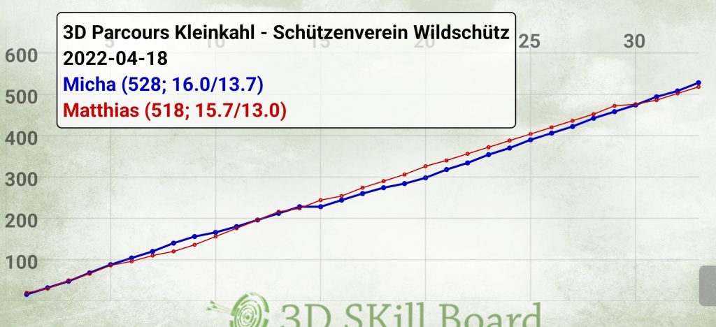 Wir hatten uns heute ein Kopf an Kopf Rennen geliefert. Bis Ziel 15, dort hab ich ne Null geschossen! Aber ich habe mich langsam rangetastet und bei Ziel 31 hab ich wieder geführt! Okay Matthias hat mich auch „unterstützt“ (An Ziel 30 eine 4 und Ziel 31 ne 10 …)