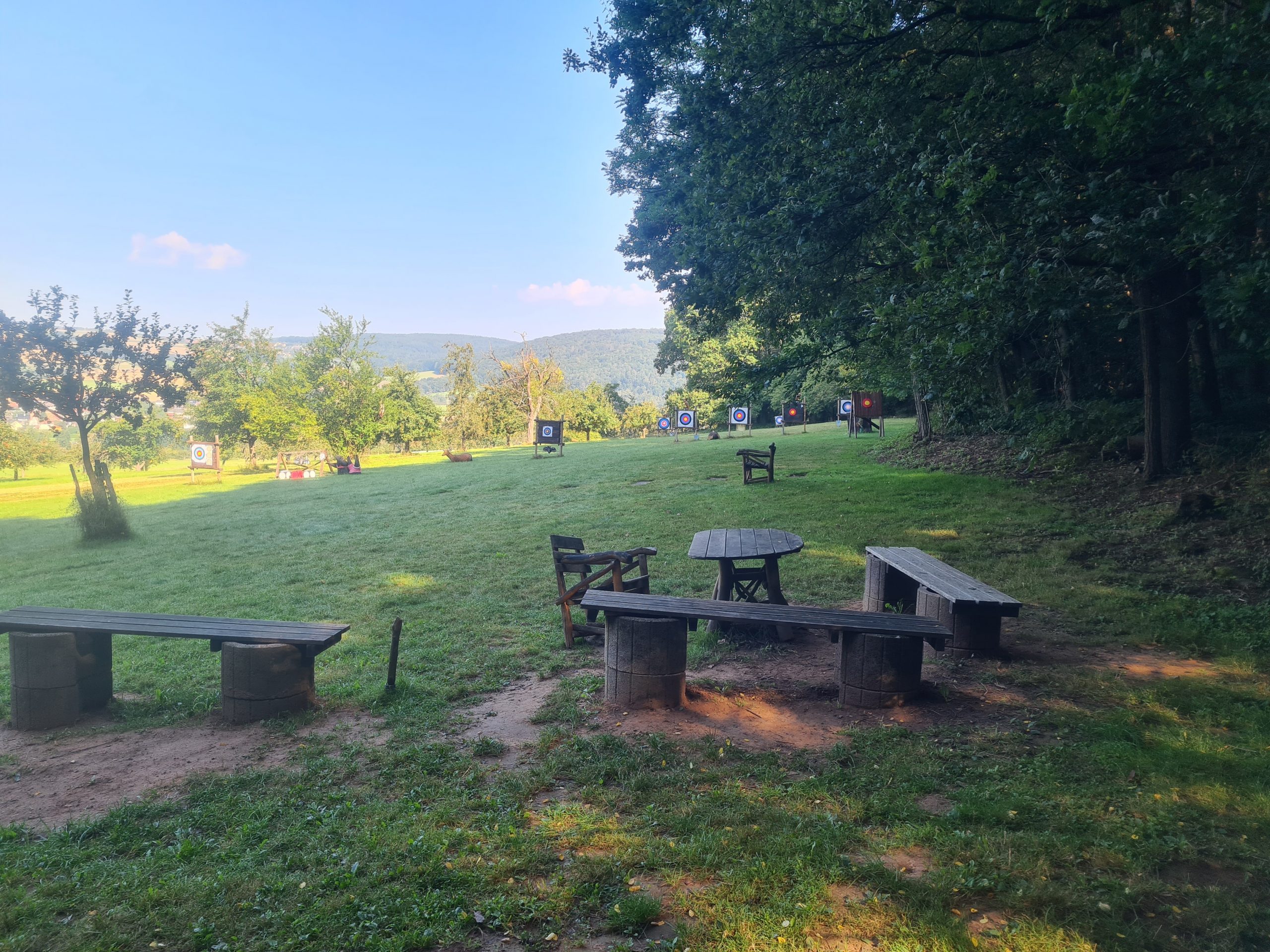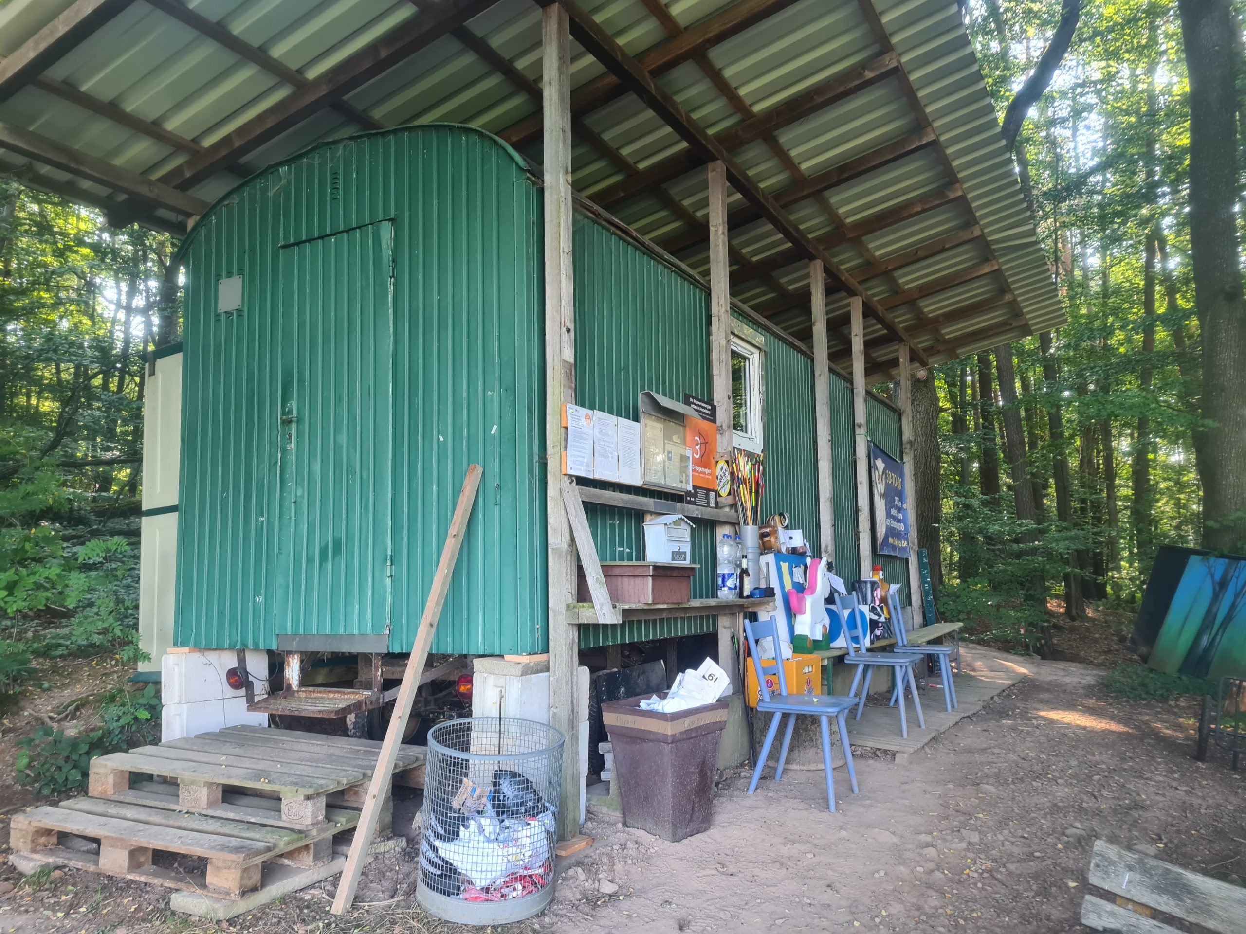 Am „Bauwagen“ meldest du dich an. Ins „Buch“ eintragen, „Anmeldezettel“ ausfüllen, mit Tagesgebühr (10 € / 14 € Compound) ins Kuvert und in den Briefkasten einwerfen. Hier liegen auch die Fundpfeile…
