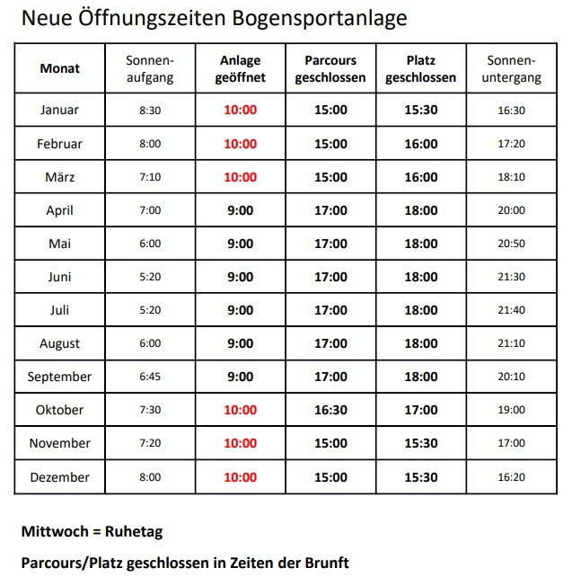 Bogensportanlagen: 9:00 – 18:00 Uhr